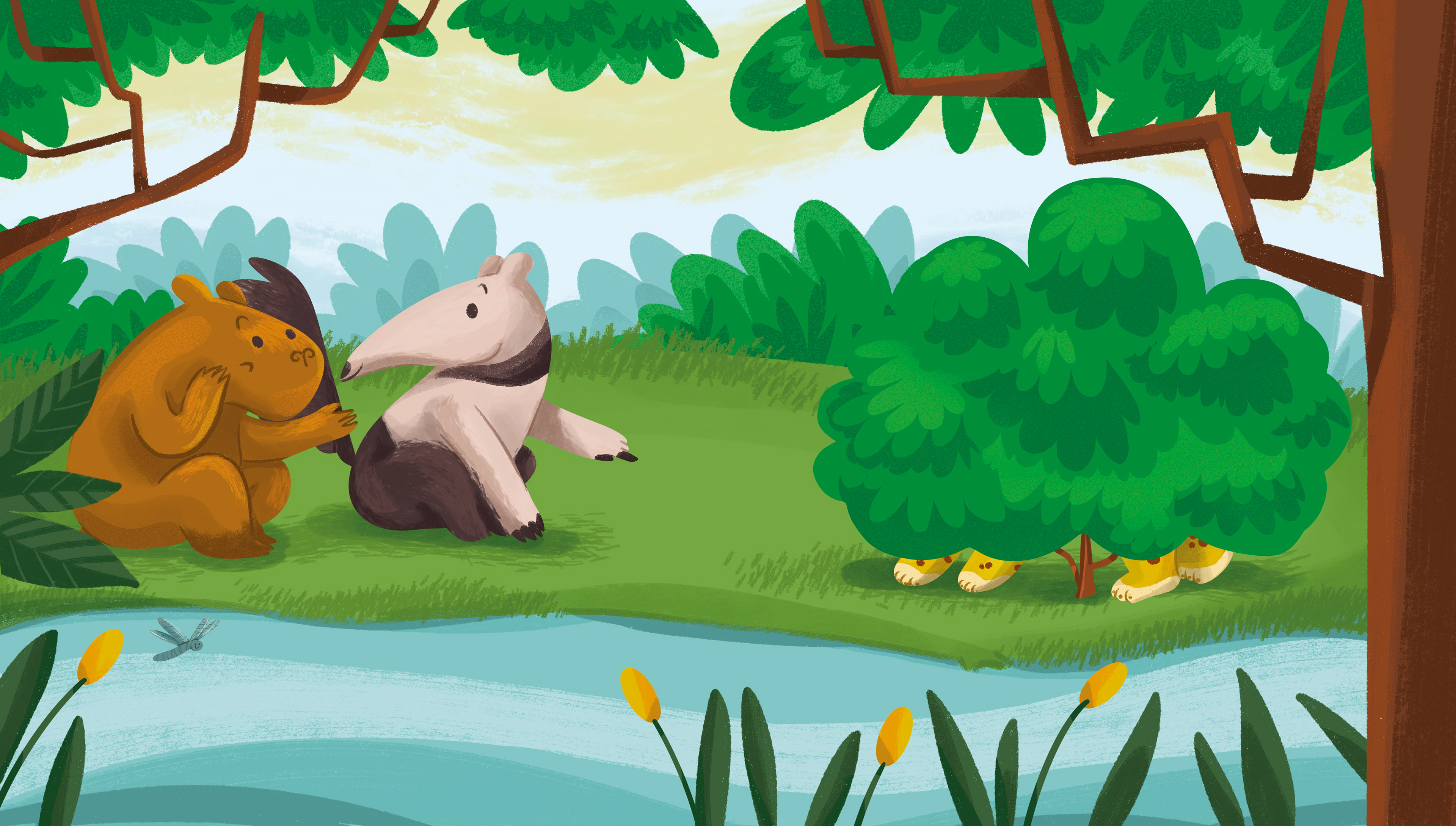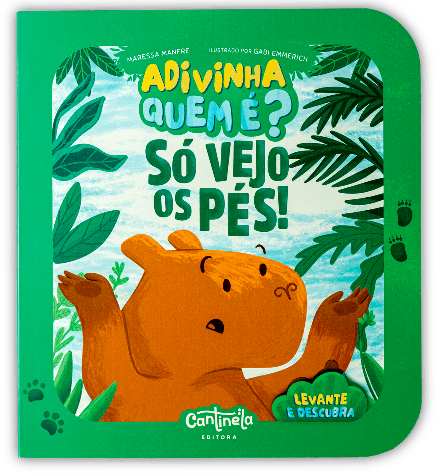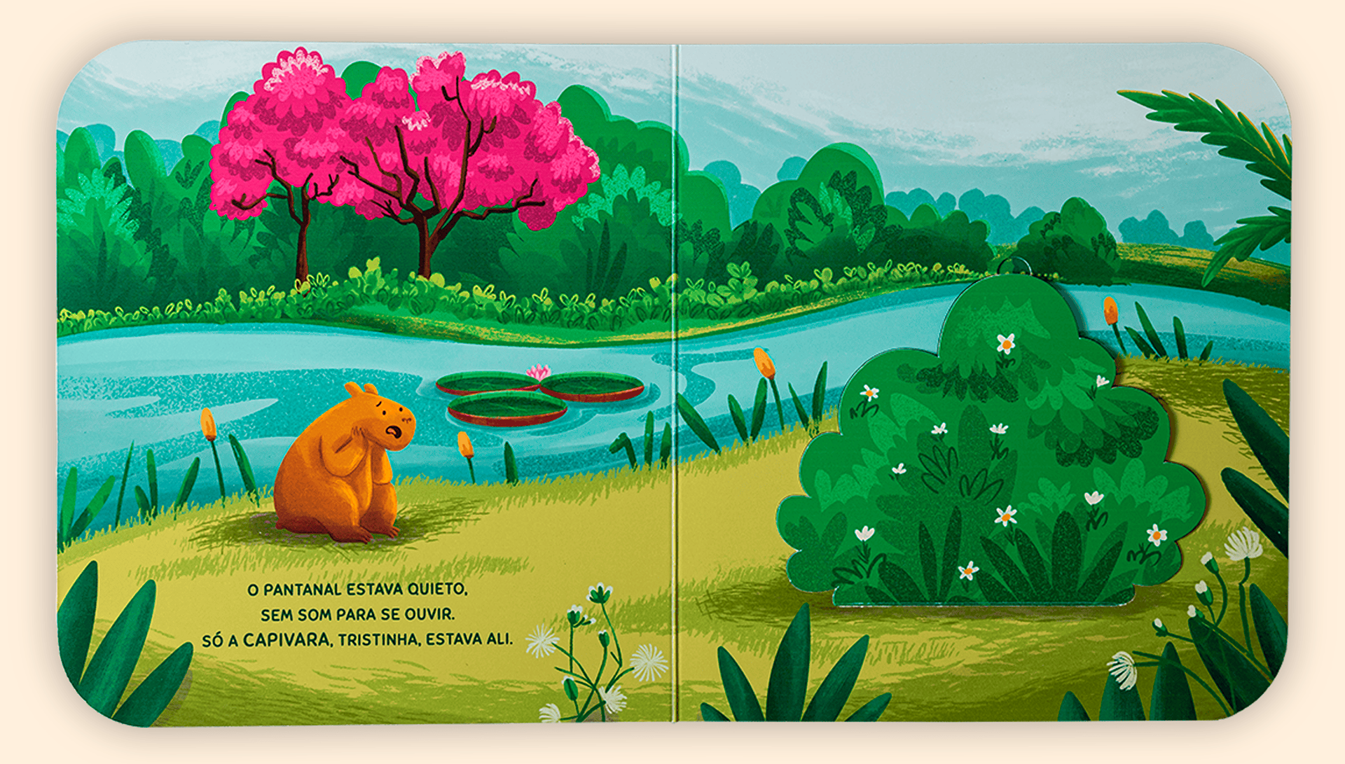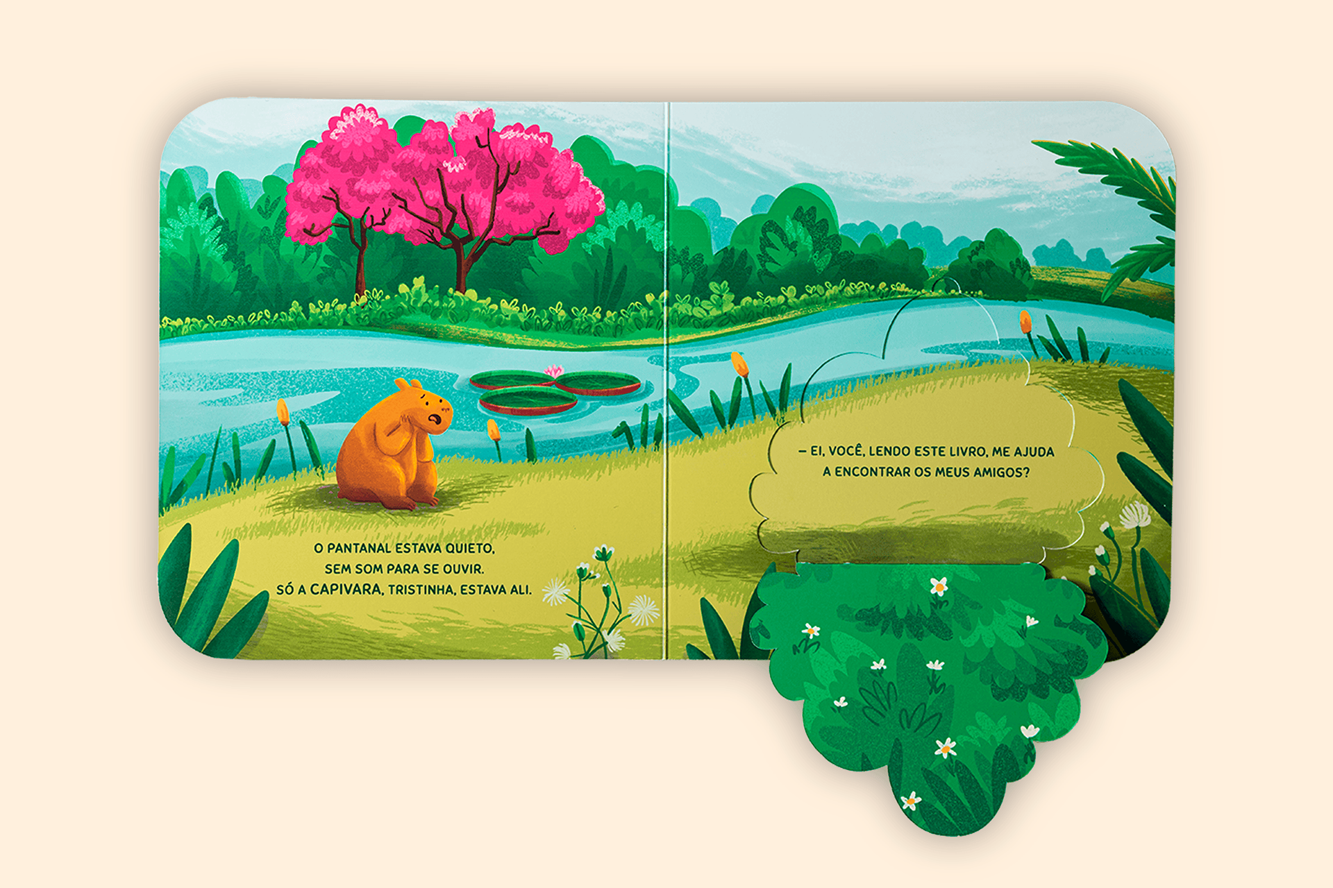 Book published by Cantinela Publishing, featuring interactive flaps that turn reading into playful discovery. Children are invited to uncover animals from the Brazilian fauna, especially those from the Pantanal, hidden within the pages.