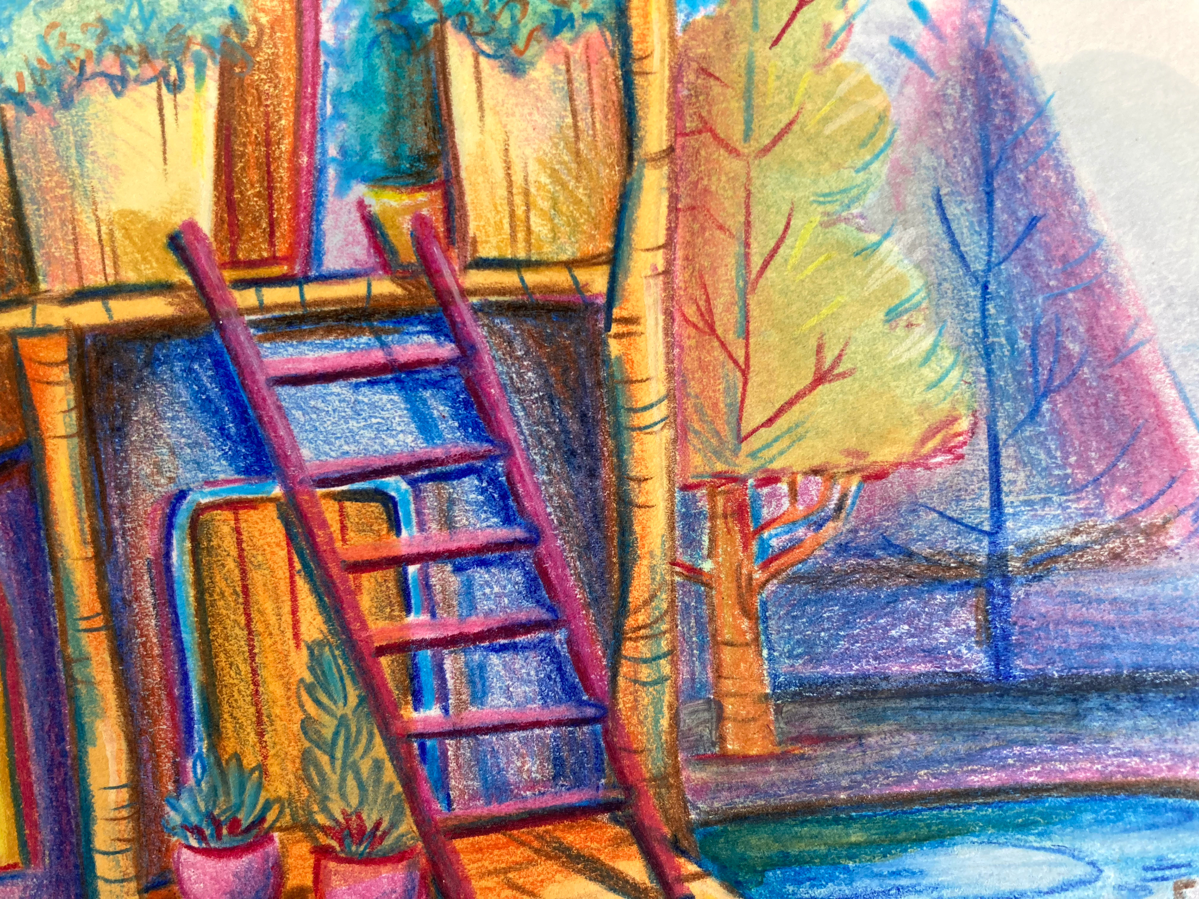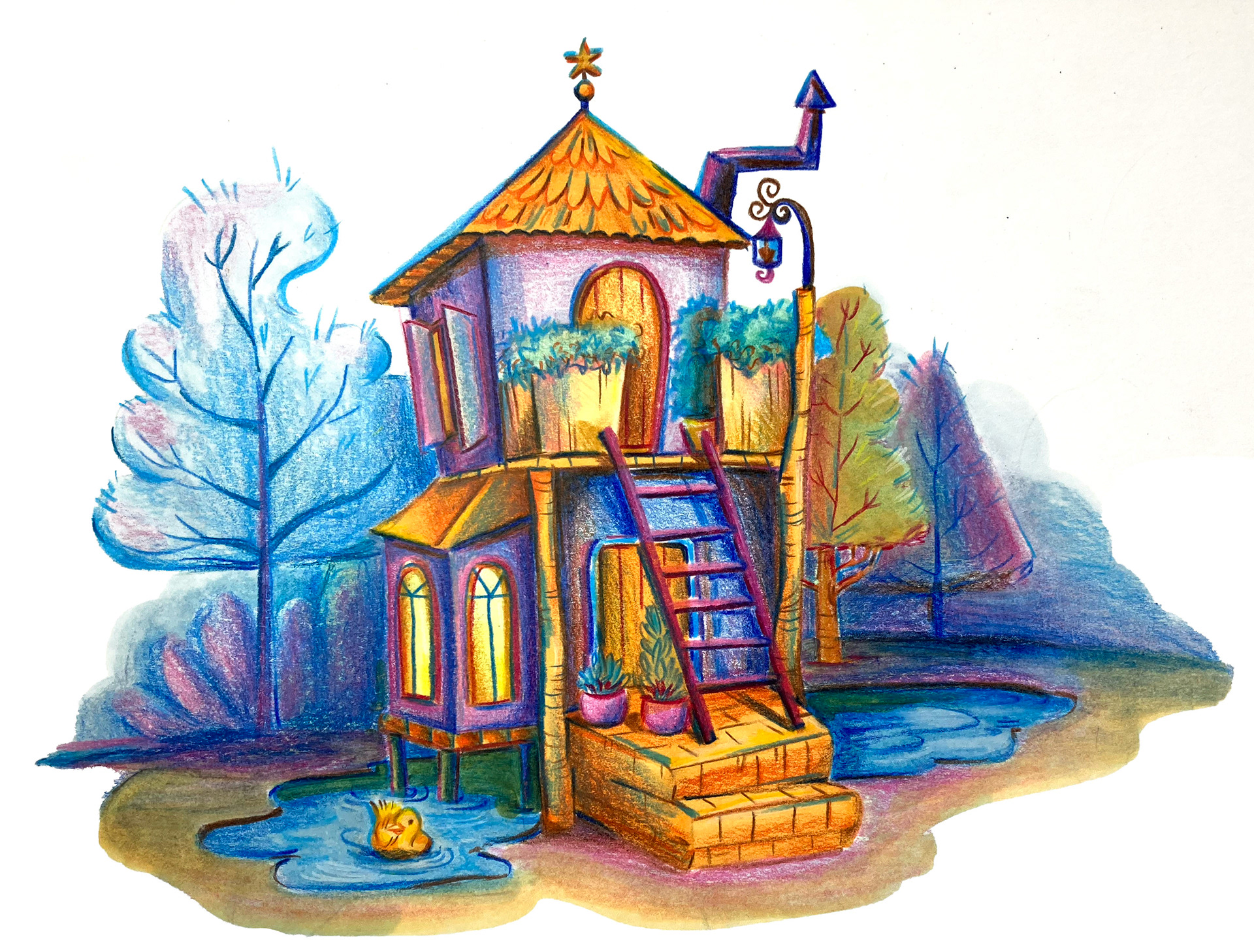 Illustration of the Witch's house, in the middle of the countryside, with a lake and a pet duck. Personal project to explore possibilities with colored pencils and markers.